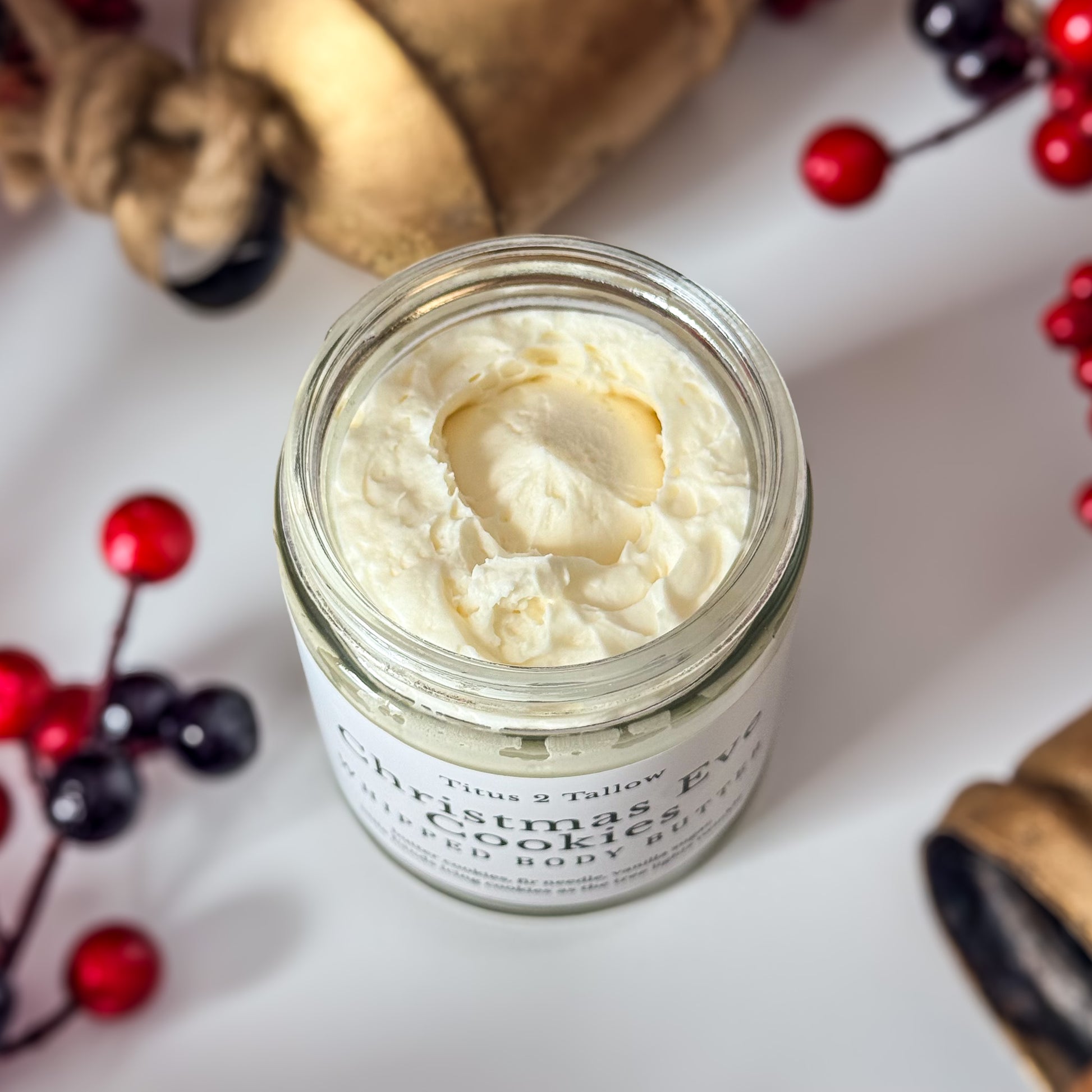 Soft and cushiony, this whipped tallow body butter smooths over dry skin with the cozy scent of Christmas Eve. It blends the warm scents of fresh-baked cookies and vanilla sugar with a subtle touch of fir from the Christmas tree. Made with nourishing tallow, it locks in moisture and soothes winter-dry skin, transforming your nightly moisturizing routine into a peaceful, festive moment.