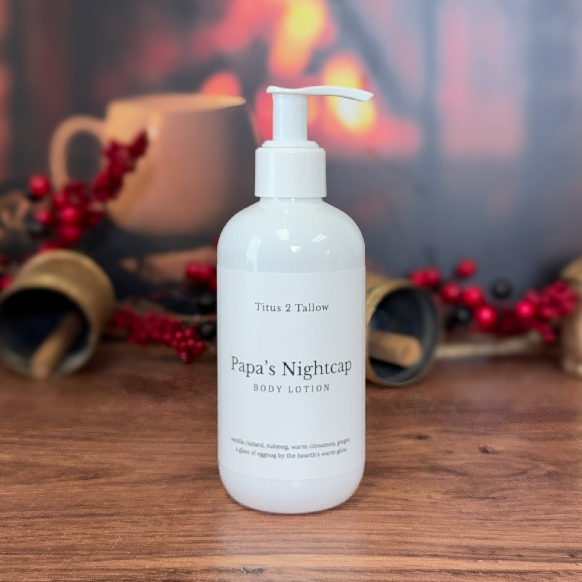 Papa's Nightcap Body Lotion combines tallow's natural conditioning benefits in an effortless, lightweight formula perfect for everyday care. It glides onto skin smoothly, providing lasting softness and nourishment that feels gentle and comforting. Infused with the warm embrace of vanilla custard, nutmeg, cinnamon, and a touch of ginger, this lotion wraps you in the nostalgic feeling of holiday gatherings—cozy evenings by the fire with twinkling lights and cherished moments.