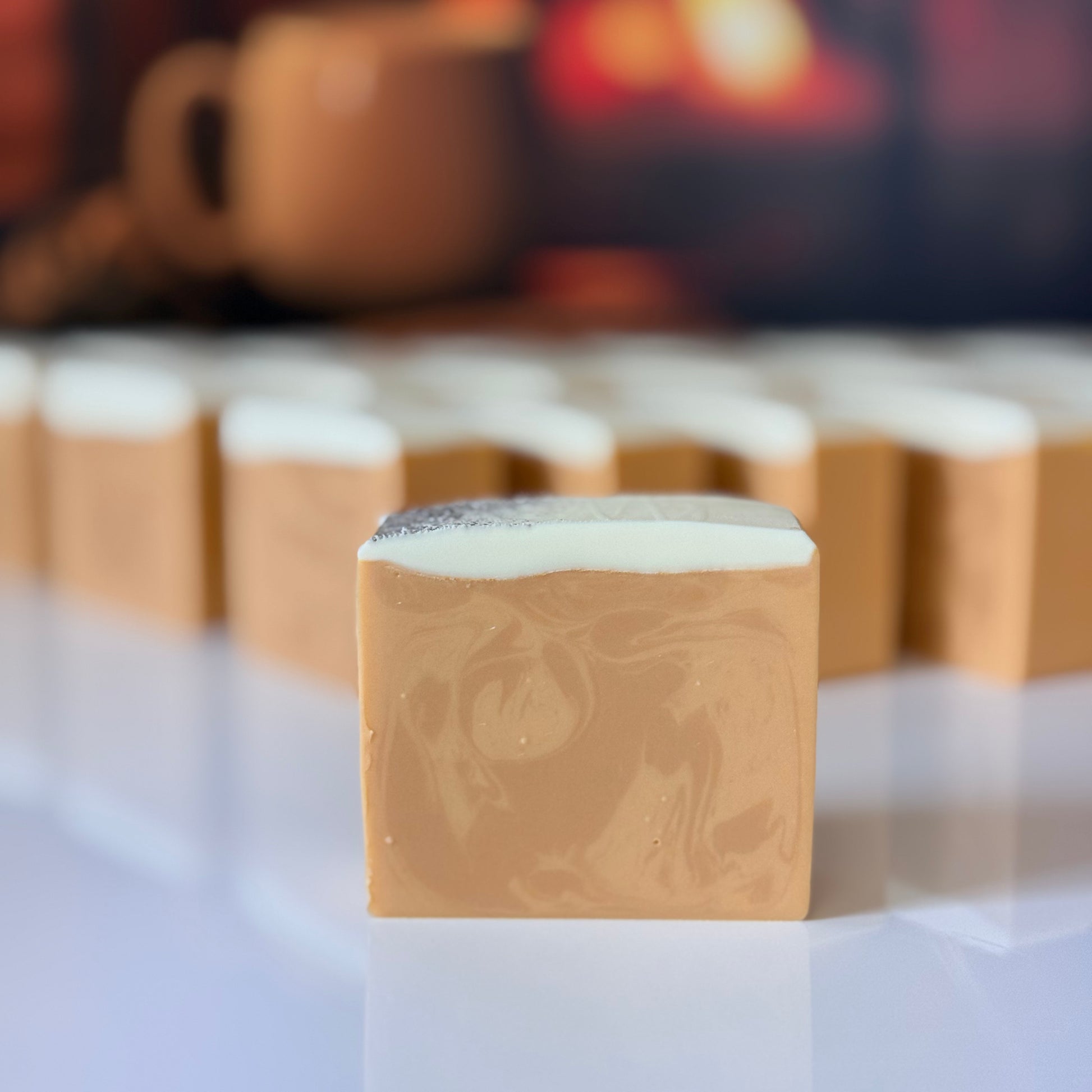 Swirls of custard and caramel blend seamlessly through the bar, crowned with a smooth, whipped cream-like layer and a hint of nutmeg. This comforting, spicy eggnog scent captures the cozy end of the day—warm spices filling the air, the glow of the tree, and the soft voices of children asking for just one more story. Crafted with tallow, it produces a rich, gentle lather perfect for embracing the season’s calm moments.