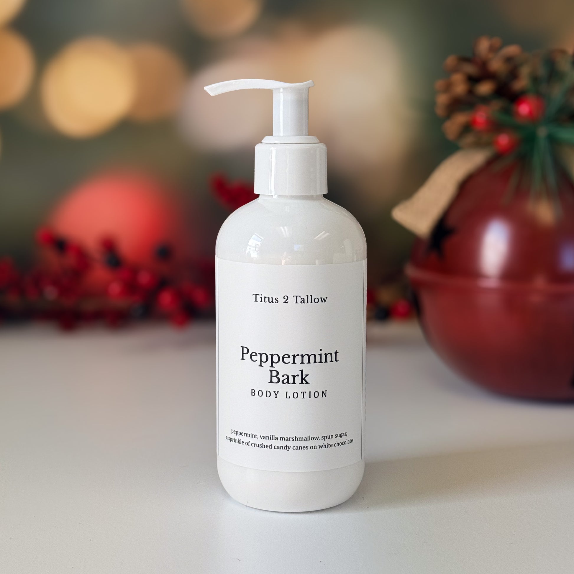 Peppermint Bark Body Lotion combines tallow’s natural conditioning benefits in an effortless, lightweight formula made for everyday care. It glides on smoothly, leaving skin softly nourished and comfortable through the winter days. Cool peppermint meets mellow vanilla sweetness—like candy canes sprinkled over white chocolate—wrapping you in a cheerful, festive scent that feels bright, cozy, and easy to wear all season.